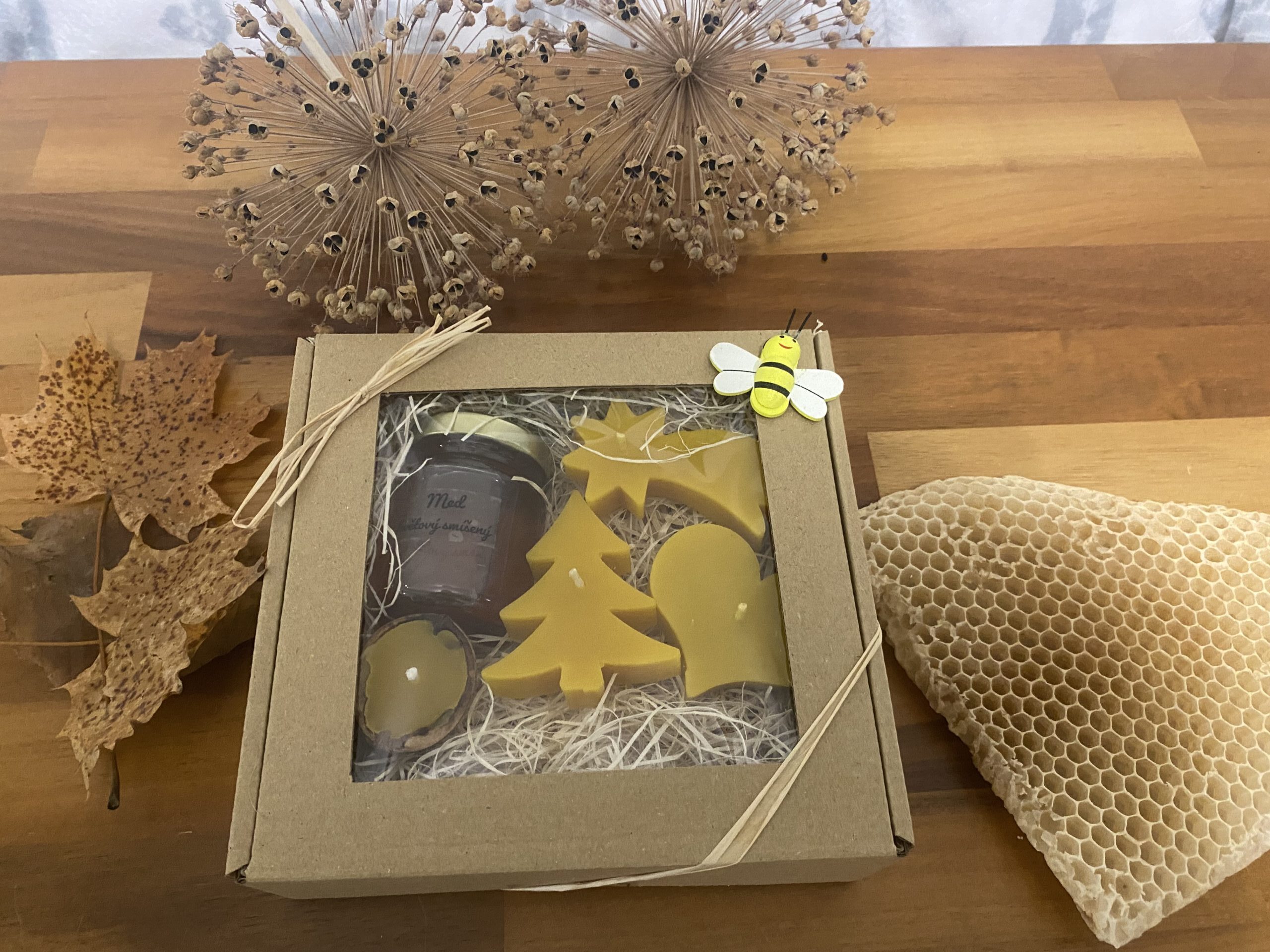 Sklenička med květový smíšený 75g a svíčka ze včelího vosku průměr 3 x7cm , 3 ks čajové svíčky a plovoucí svíčka. Balení papírová krabička.